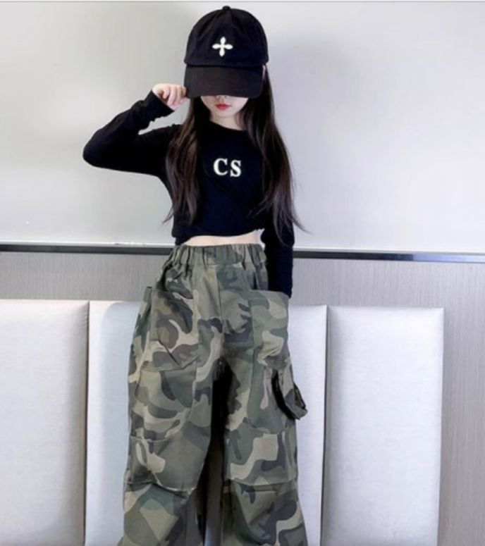 ชุดเซ็ตเด็ก เสื้อยืดดำ+กางเกงลายพรางทหาร สีเขียว สไตล์สตรีท เท่