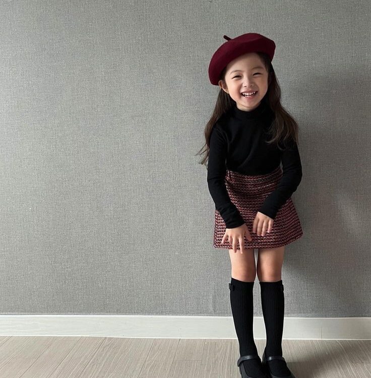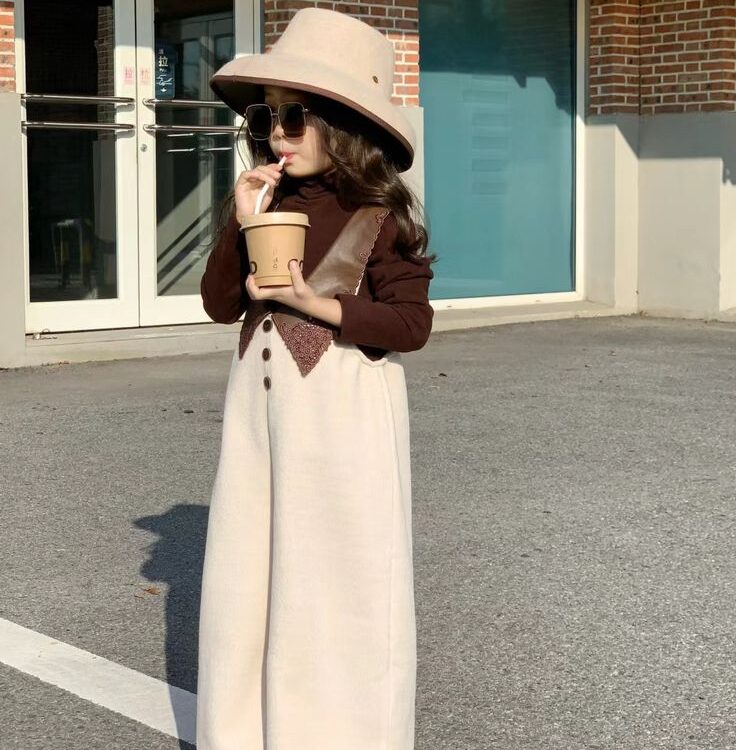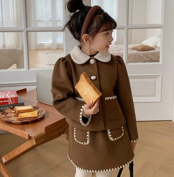 Audrey - ชุดเอี๊ยมกระโปรงสีน้ำตาลเข้ม มีกระเป๋าหน้าและเสื้อแขนยาวสีขาว