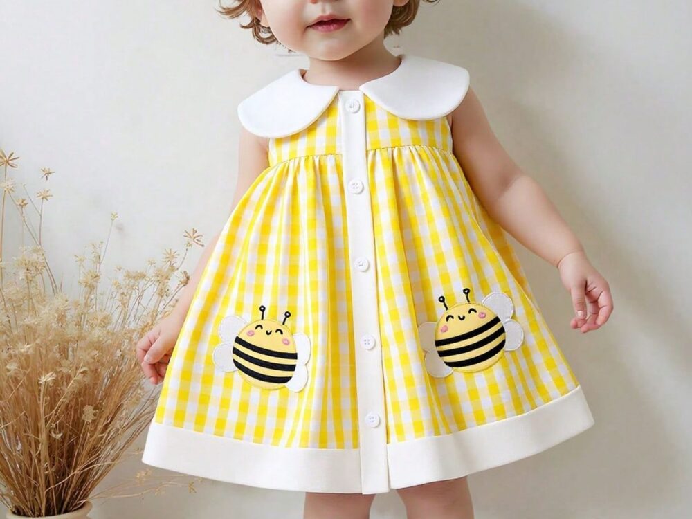 Ava - ชุดเดรสสีเหลืองลายผึ้ง คอปกบัวใหญ่