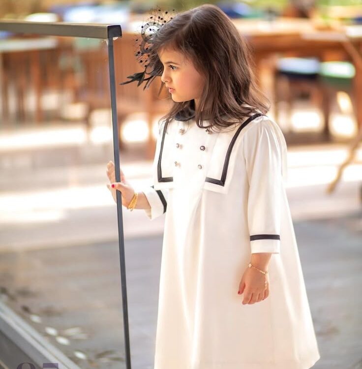 Eleanor - ชุดเดรสสีครีมแขนยาว คอปกบัวสีน้ำเงินพร้อมริบบิ้น